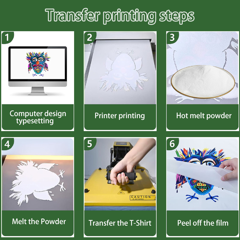 2. Powder Application and Curing: A dedicated DTF hot-melt adhesive powder is evenly applied to the surface of the printed pattern. After removing excess powder, the film is placed in a curing oven or heat press for low-temperature curing, allowing the powder and ink to fully fuse;