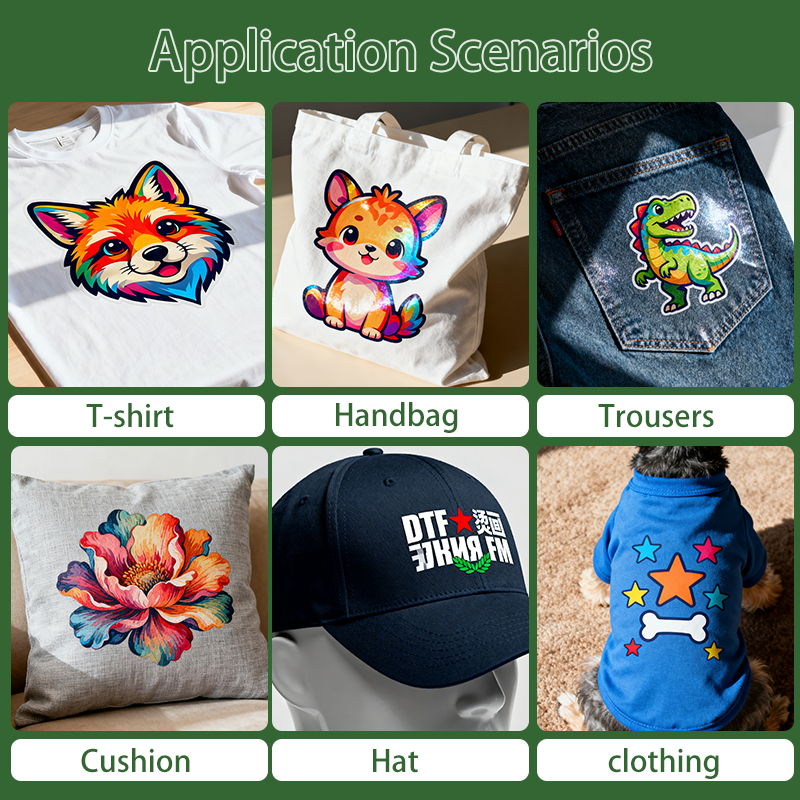 This product boasts exceptional versatility, requiring no pre-treatment of the substrate. It is perfectly compatible with virtually all fabrics, including cotton, polyester, nylon, blends, leather, canvas, and denim. It also works with both dark and light-colored materials, completely overcoming the limitations of traditional DTG (direct-to-garment) printing and the restriction of sublimation printing to only polyester fibers. One film can meet the transfer needs of multiple categories and materials, significantly improving production flexibility and efficiency, and adapting to both small-batch customization and large-scale mass production.